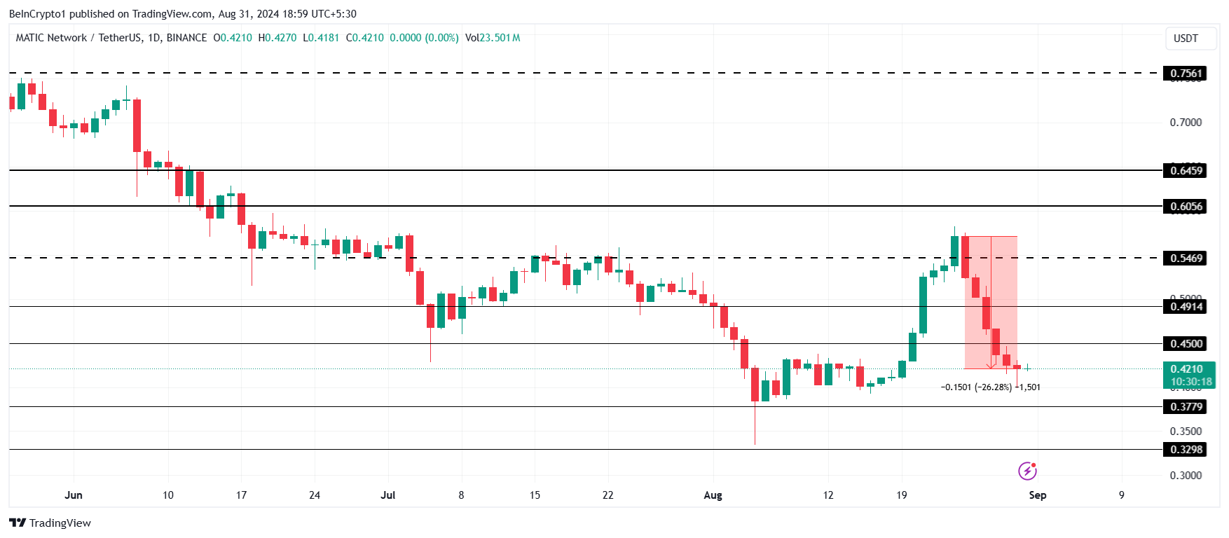 Após a transição, no dia 4 de setembro, o preço do MATIC poderá começar a se recuperar da recente queda de 26%. Isso poderia resultar na altcoin recuperando o suporte de US$ 0,50, marcando uma alta de dois meses.