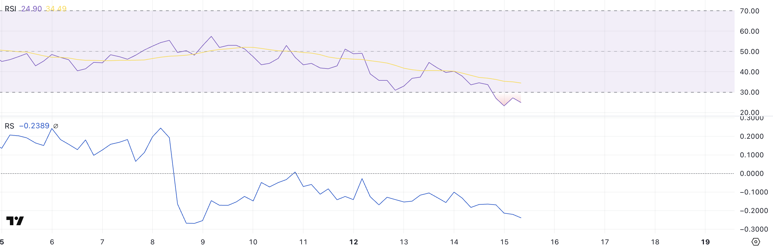 SponsoredO RSI do ativo está em 23,95 — sinalizando território de sobrevenda. Isso pode indicar que a moeda está próxima de um ponto de reversão, após uma onda de liquidações agressivas.