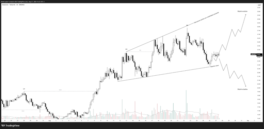 A Chainlink apresenta um padrão expansivo com máximas e mínimas ascendentes, acompanhadas por aumento de volatilidade. O suporte chave está localizado em torno de US$ 24, um nível a partir do qual os compradores tentaram sustentar a estrutura de alta.