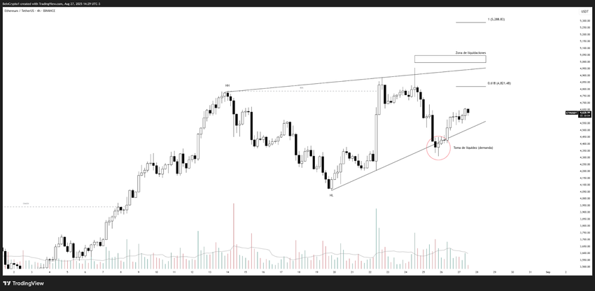 O gráfico do Ethereum reflete uma estrutura ascendente com uma recente captura de liquidez na área de US$ 4.350, o que permitiu a reativação da demanda.