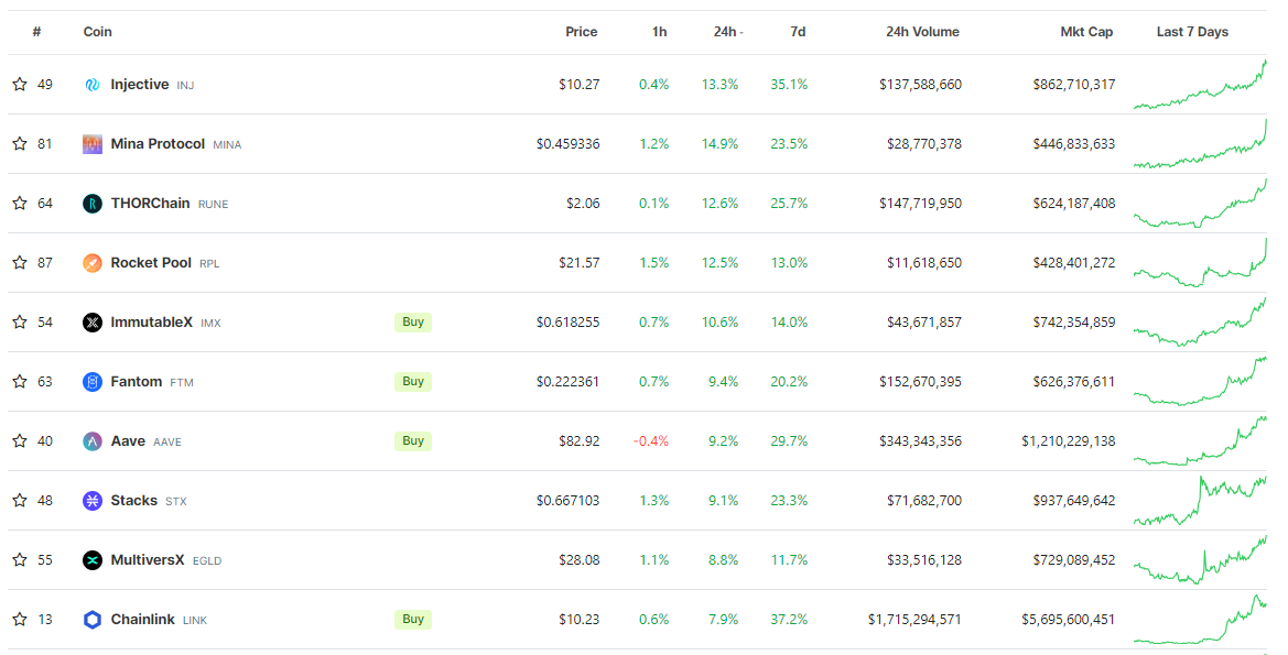 Na liderança do mercado está a Injective (INJ), que subiu 13% nas últimas 24 horas. Mina Protocol (MINA), THORChain (RUNE) e Rocket Pool (RPL) completam a lista das criptomoedas com alta acima de 10% no dia.