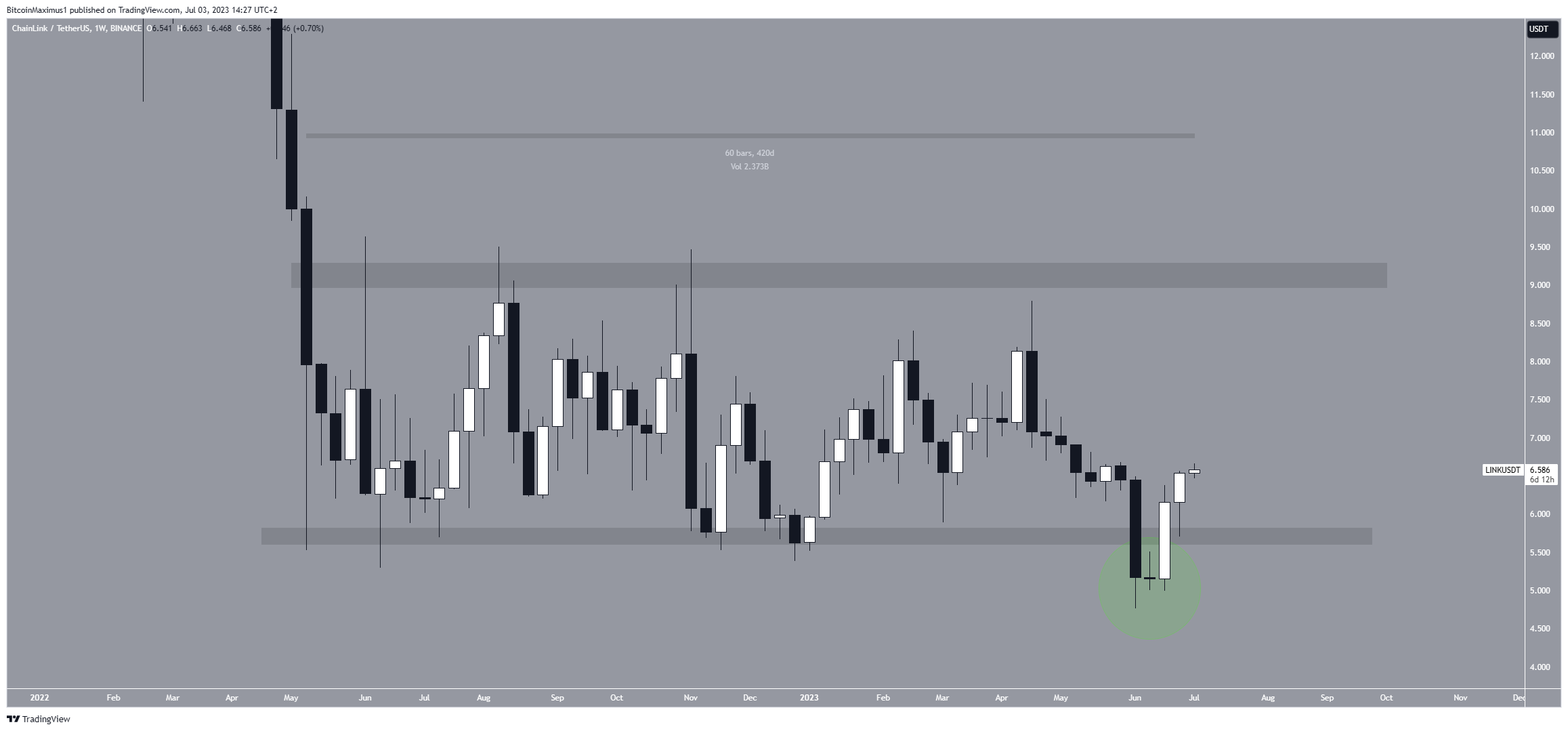 Tudo isso aparentemente mudou em junho, quando a LINK atingiu um fechamento semanal abaixo de US$ 5,75. No entanto, isso acabou sendo um desvio (círculo verde), pois o preço recuperou a área logo depois e tem subido desde então.