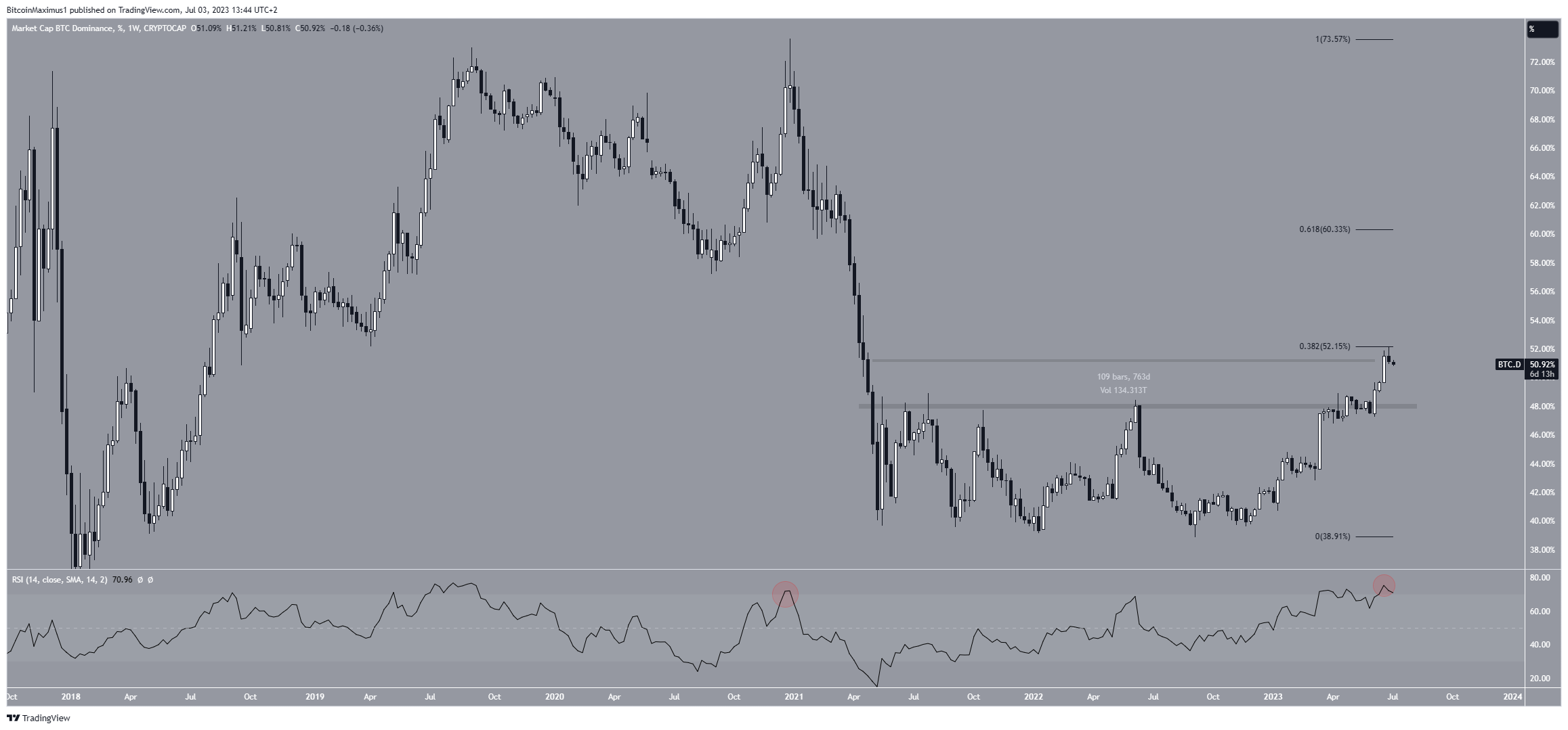 O rompimento foi crucial, pois a área já estava no local há 763 dias. Portanto, uma quebra de um nível de resistência de longo prazo geralmente leva a movimentos significativos de alta. Como esperado, o BTCD atingiu o nível de 52,20% em junho.