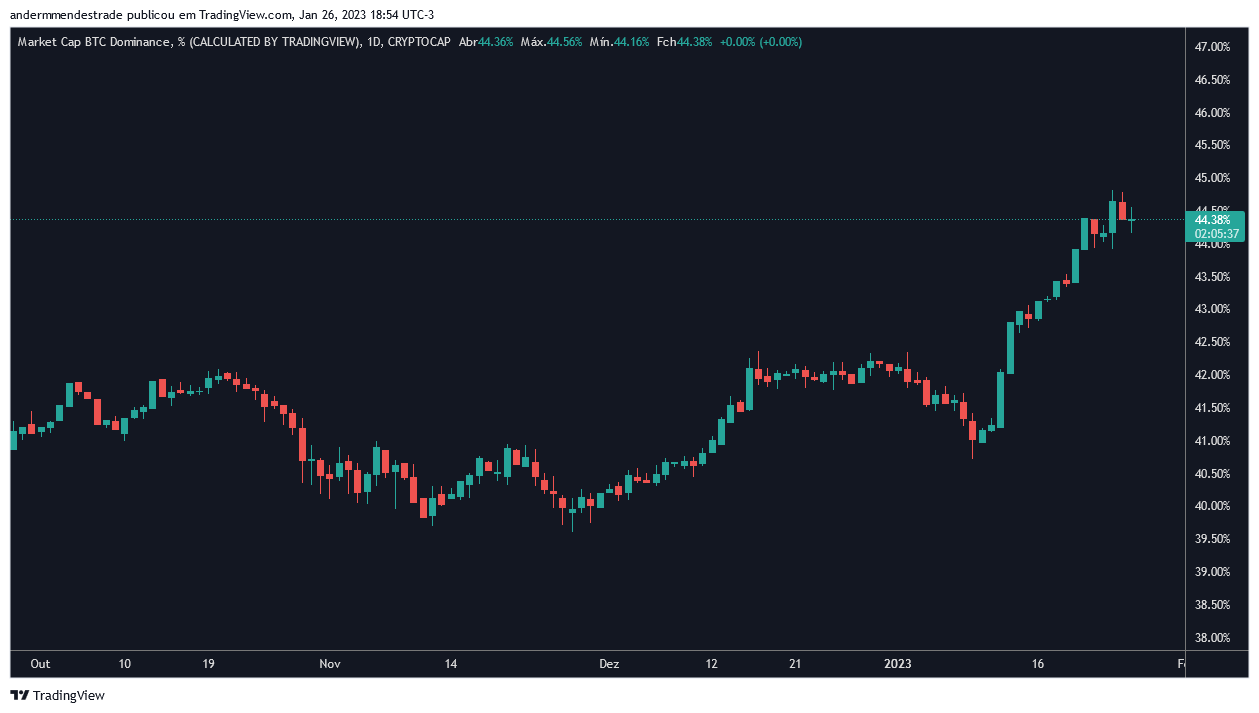 Além do mais, a maior criptomoeda do mundo segue ditando as regras. O BTCD – indicie que mede o nível de dominância do ativo em relação ao mercado cripto, está no fechamento desta matéria em 44,4, estando em forte tendência de alta desde 10 de janeiro. Para que uma nova altseason comece, seria crucial o índice reverter a tendência atual e testar novamente as mínimas em 38.