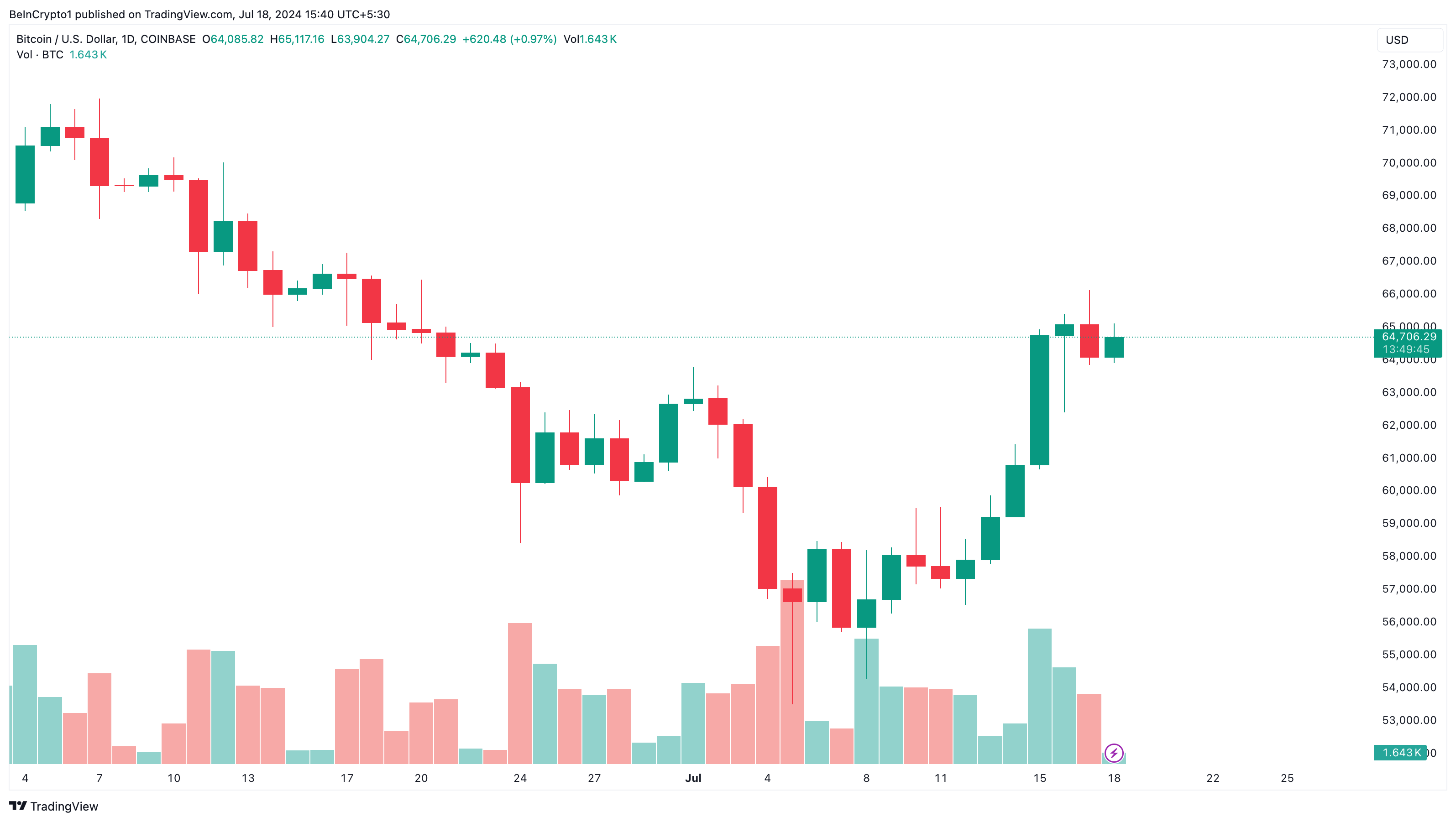 Até o momento, o BTC é negociado a US$ 64.706, uma queda em relação aos US$ 66.189 da quarta-feira (17).