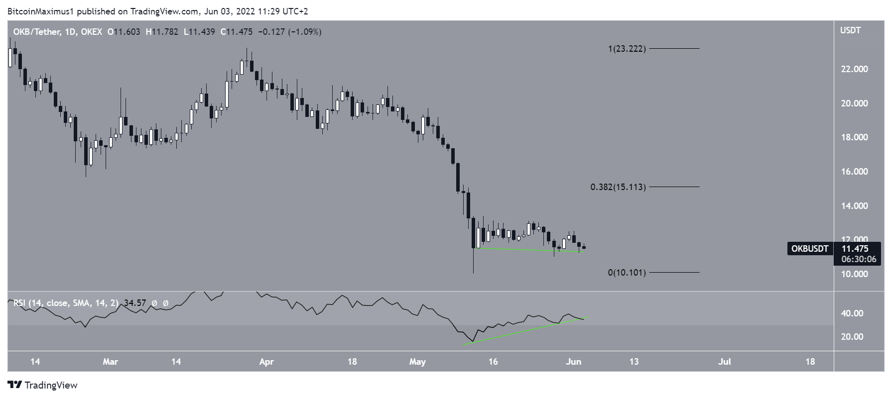 O OKB atingiu uma mínima de US$ 10 em 12 de maio, mas saltou acentuadamente e criou um longo pavio inferior logo depois. Atualmente, ele está sendo negociado a US$ 11,40 e aparentemente criou um padrão de fundo triplo.