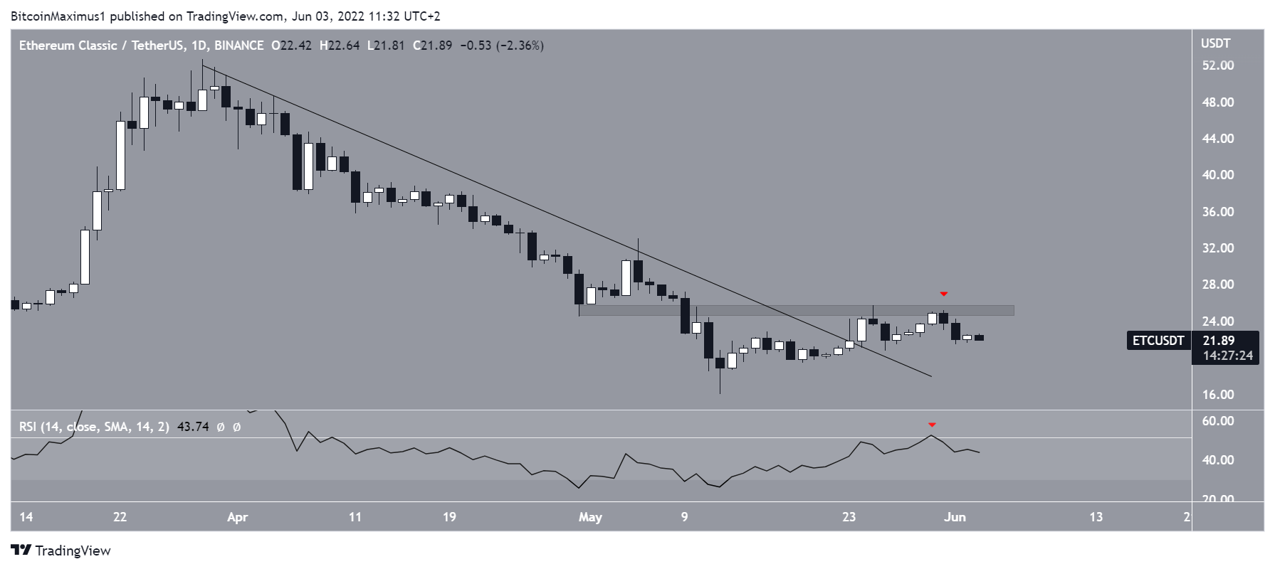 O ETC está caindo abaixo de uma linha de tendência de baixa desde 9 de março. Isso levou a uma mínima de US$ 16,02 feita em 12 de maio.