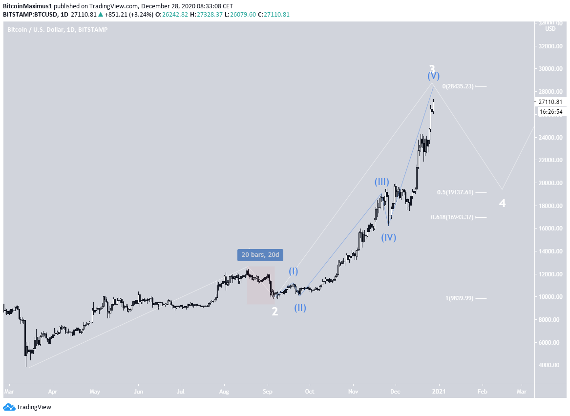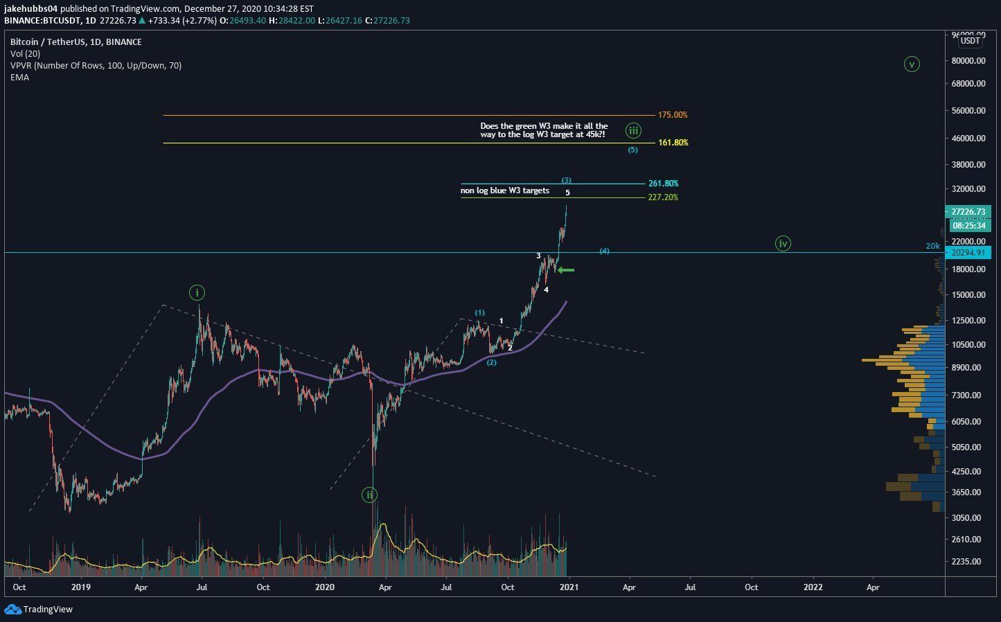 O trader de criptomoedas @TheTradingHubb traçou um gráfico para o BTC dando $ 29.000- $ 32.000 como uma área possível para o topo do movimento. A contagem de ondas se ajusta ao que descrevemos, em que a onda 5 do BTC completa da onda 3 do ciclo.