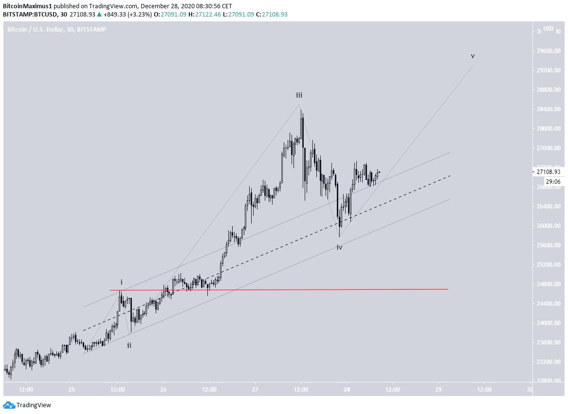 Finalmente, o gráfico de 30 minutos sugere ainda que há mais uma pequena alta de sub-onda antes que o BTC chegue ao fim do movimento. Isso é perceptível pela formação de retração da 4ª onda.