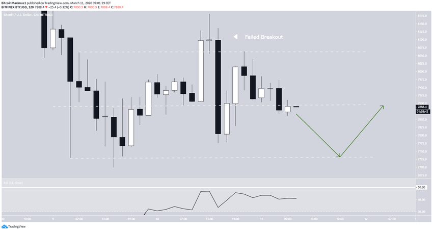 Hoje marca o quarto dia consecutivo em que o preço do BTC foi negociado entre as áreas de suporte e resistência de US $ 7.750 e 8.250. Embora tenha atingido o nível de suporte duas vezes na forma de longas sombras inferiores, ainda não validou a resistência.