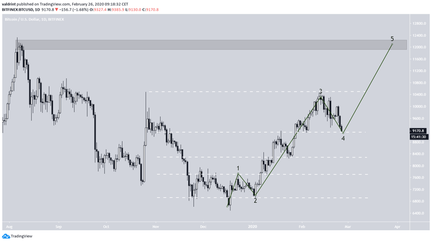 O movimento mais provável parece ser uma formação Elliott de cinco ondas, que levaria o preço a US $ 12.000. Para que a formação permaneça válida, o preço do Bitcoin teria que subir à partir daqui. Um fechamento diário abaixo desta área indica que estamos caminhando para US $ 8300.