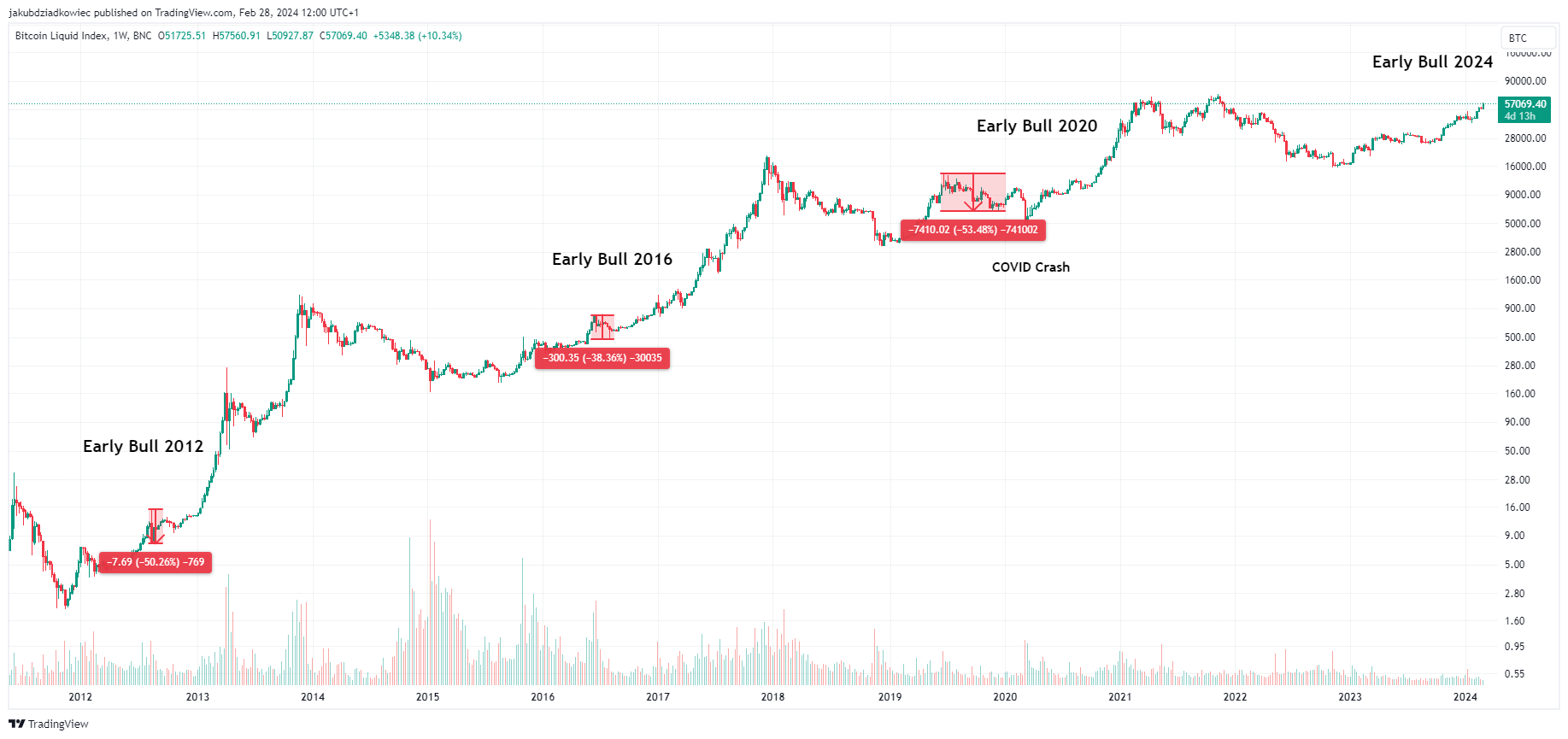 Acontece que a correção foi sempre bastante profunda: 50% em 2012, 38% em 2016 e 53% em 2020. Assim, nos três ciclos anteriores, a média foi de 47%.