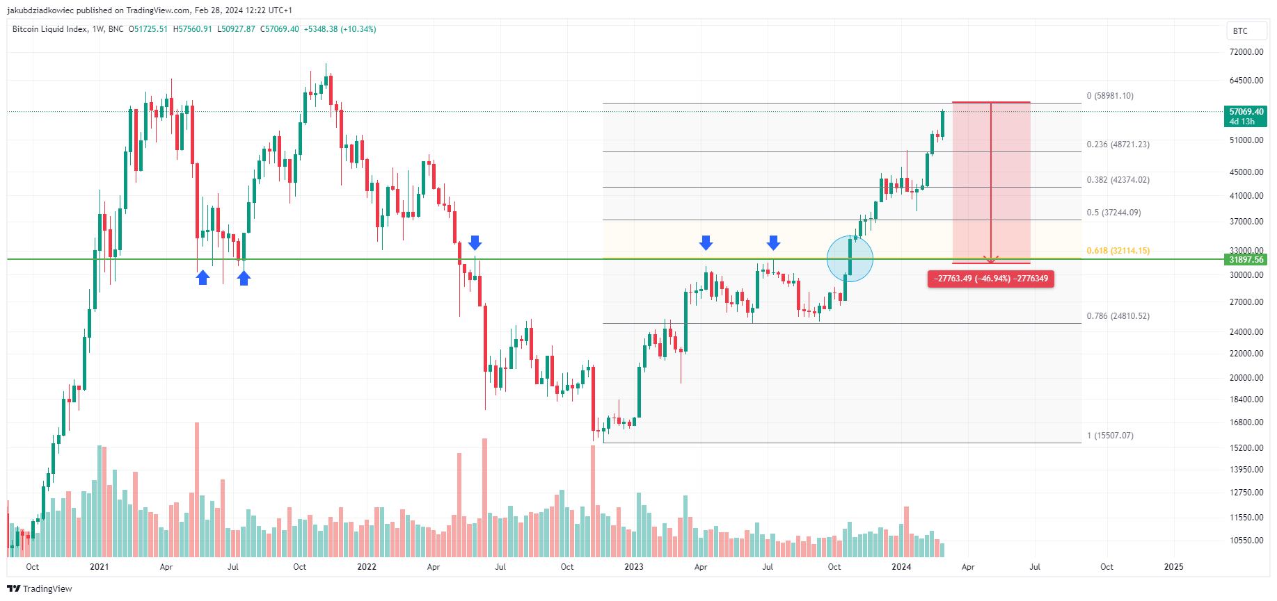 SponsoredSe sobrepormos uma possível correção do preço do BTC no gráfico atual, surgirão correlações técnicas interessantes. Uma queda de 47% da área atual de US$ 59.000 levaria o preço para US$ 32.000 (linha verde).
