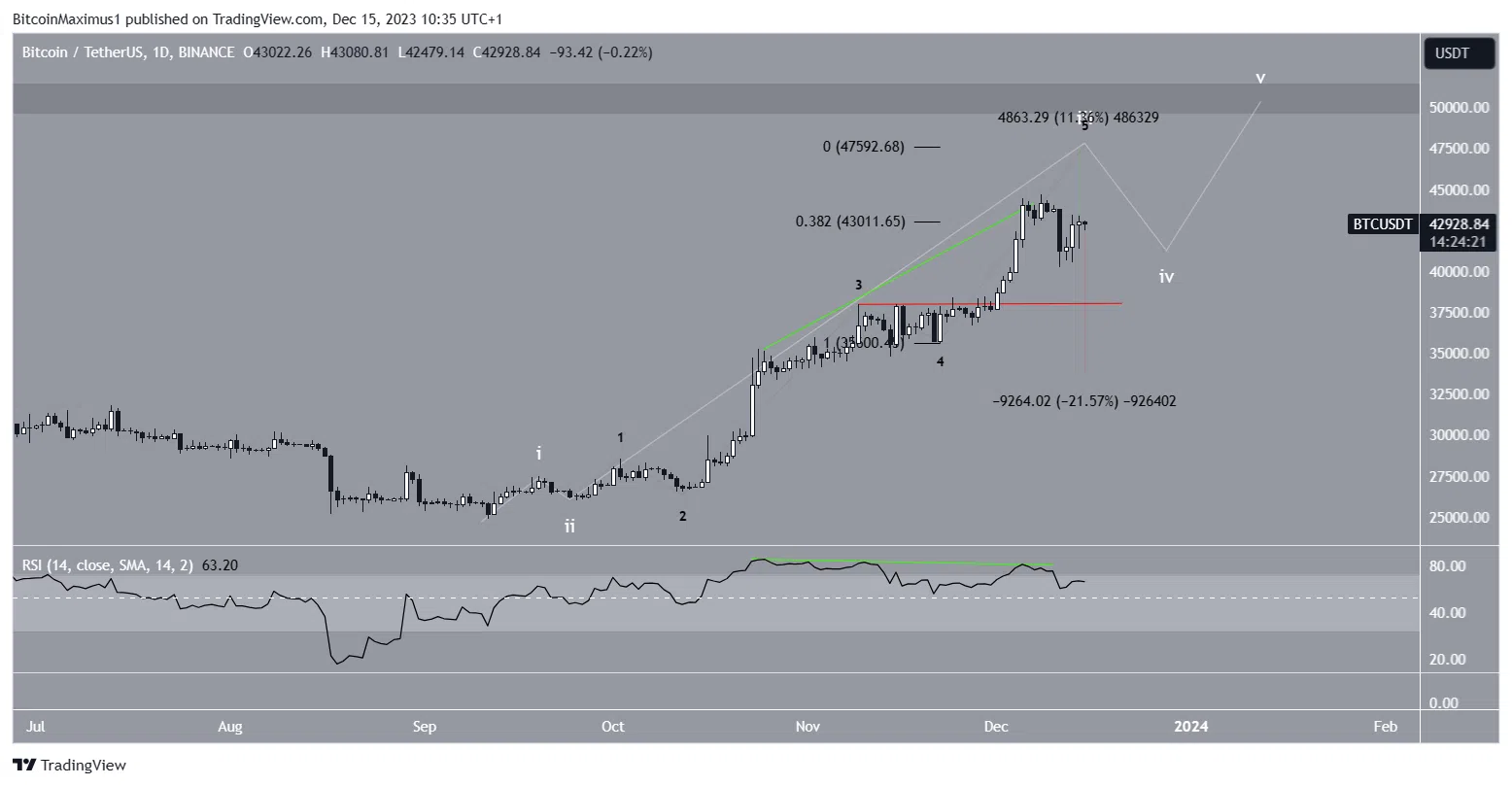 Posteriormente, o preço do Bitcoin pode iniciar a onda corretiva quatro. A divergência de baixa (destacada em verde) no RSI sugere que o movimento está se aproximando do fim.