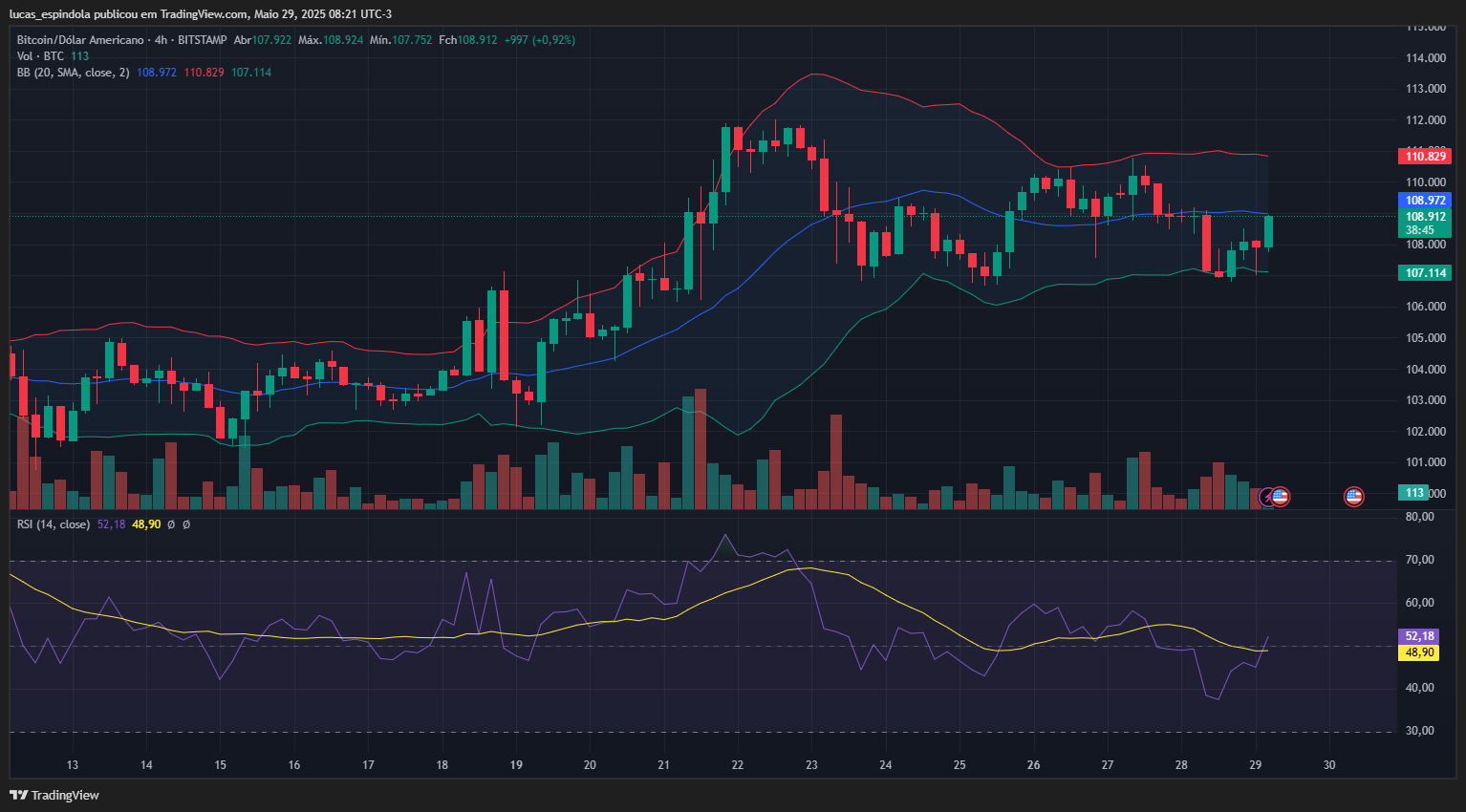 O Bitcoin (BTC) iniciou a quinta-feira (29) com alta de 0,93%, sendo cotado a US$ 108.914 no gráfico de 4 horas. O movimento mostra uma reação positiva após o suporte em US$ 107.114 segurar a queda dos últimos dias. A recuperação ocorre dentro de uma zona de consolidação, ainda abaixo da resistência crítica de US$ 110.829.