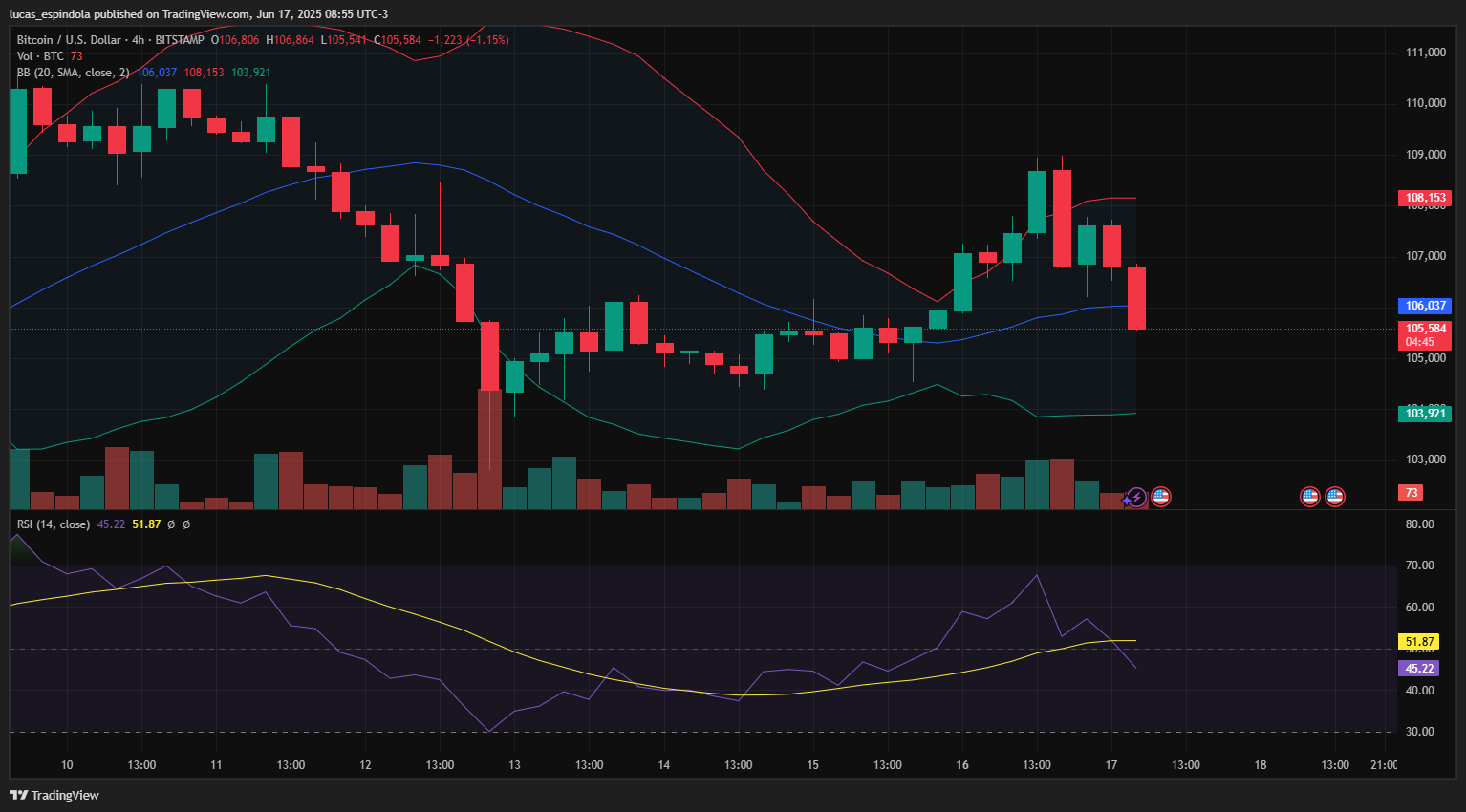 Nesta terça-feira (17), o Bitcoin (BTC) iniciou o dia em queda, sendo negociado por volta de US$ 105.541 no momento da publicação. A criptomoeda acumula desvalorização de 1,19% nas últimas 4 horas, após não conseguir romper a resistência próxima de US$ 108 mil.