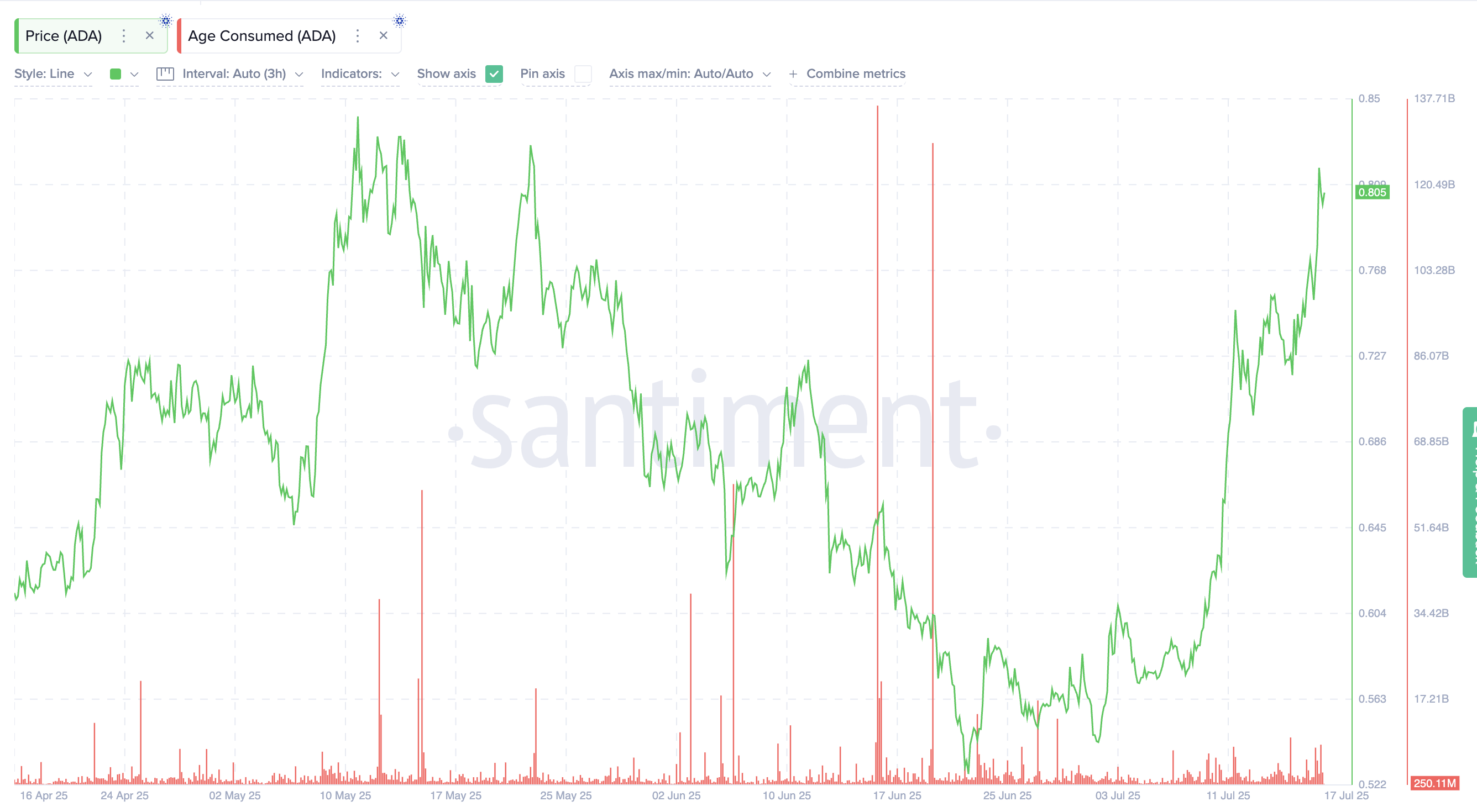 Apesar do rápido aumento de preço da ADA, a métrica Age Consumed não mostra sinais de movimentação de tokens antigos. O último grande pico ocorreu em meados de junho, quando mais de 130 bilhões de tokens ADA antigos foram movimentados. Desde então, a atividade permaneceu baixa, com o valor mais recente próximo de 250 milhões de ADA.