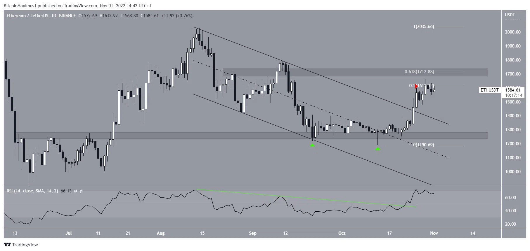 Os indicadores técnicos são otimistas. Embora o RSI não tenha gerado uma divergência de alta, ele saiu de sua linha de tendência de baixa (verde) em 23 de outubro e agora está acima de 50. O preço do ETH rompeu do canal dois dias depois e atingiu um topo em US$ 1.663 no último sábado.