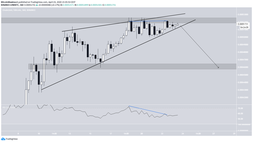 O preço do LINK tem aumentado rapidamente desde 7 de abril. A partir de 13 de abril, o preço criou uma cunha ascendente, que é considerada um padrão de reversão de baixa. Desde então, o preço está sendo negociado dentro dessa cunha.