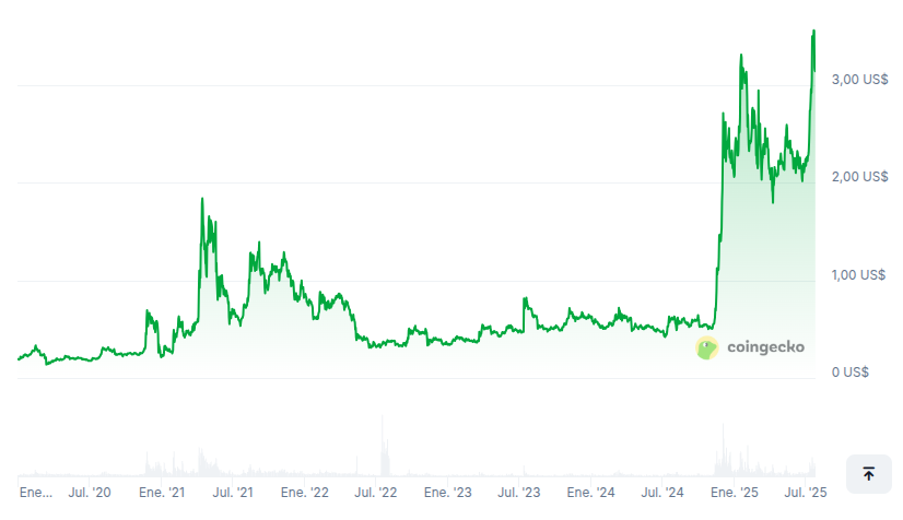 SponsoredConsiderando a alta recente alcançada em 18 de julho de 2025 a US$ 3,66, o valor teria se aproximado de 16.650 dólares. Esses números representam um retorno de 1.329% ao preço atual (de US$ 3,14, de acordo com dados do BeInCrypto) e 1.565% se considerarmos a recente ATH.