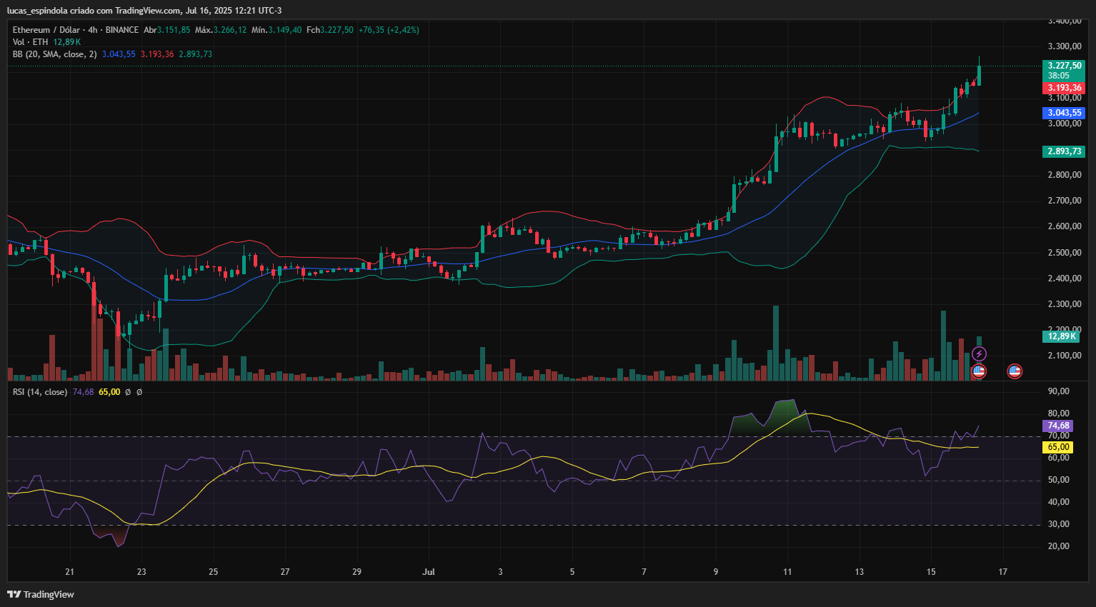 As Bandas de Bollinger, indicador que mede a volatilidade do mercado, mostram que o ETH rompeu a banda superior em um movimento explosivo. Esse rompimento geralmente indica excesso de demanda, especialmente quando ocorre acompanhado de grandes volumes — como observado no gráfico de 4 horas. A média central das bandas, localizada em US$ 3.043, passa agora a atuar como primeiro suporte relevante.