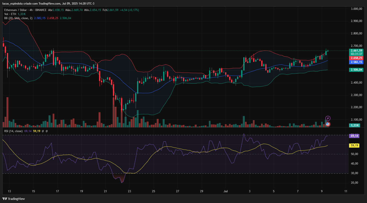 A resistência mais próxima agora está situada na região de US$ 2.700. Caso o ETH consiga manter o volume atual e fechar candles acima de US$ 2.660, o caminho ficará aberto para buscar patamares ainda mais altos, como US$ 2.740 ou US$ 2.800. Por outro lado, se houver rejeição e o preço voltar para dentro das bandas, a faixa de US$ 2.586 se torna crucial como suporte para manter a estrutura de alta.