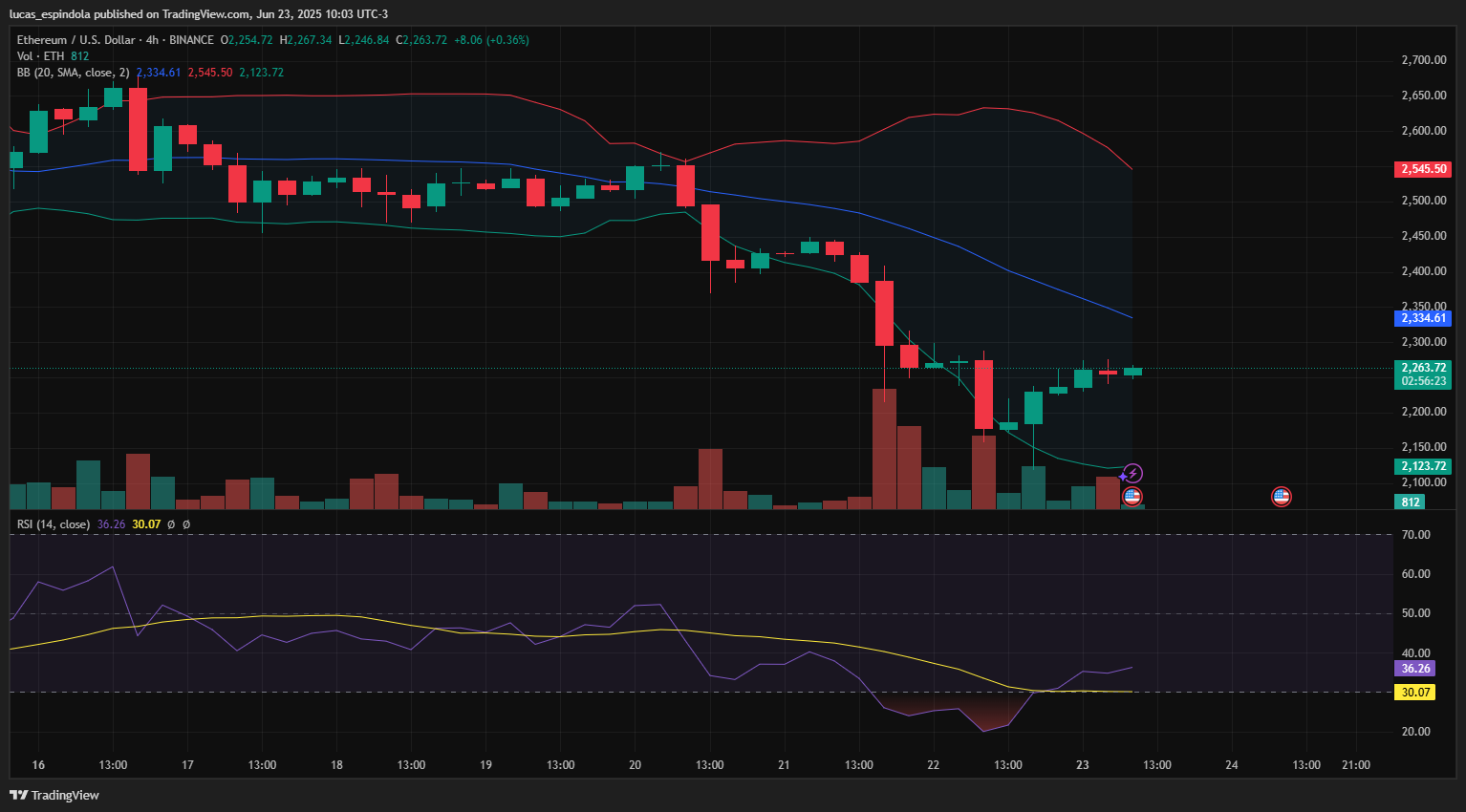 As Bandas de Bollinger, indicador que mede a volatilidade e ajuda a identificar zonas de sobrecompra e sobrevenda, mostram que o Ethereum saiu da extremidade inferior da banda. O preço agora testa a média central, localizada em torno de US$ 2.334. Caso rompa essa faixa com volume consistente, o ETH pode mirar a resistência seguinte, que está posicionada na banda superior, perto de US$ 2.545.