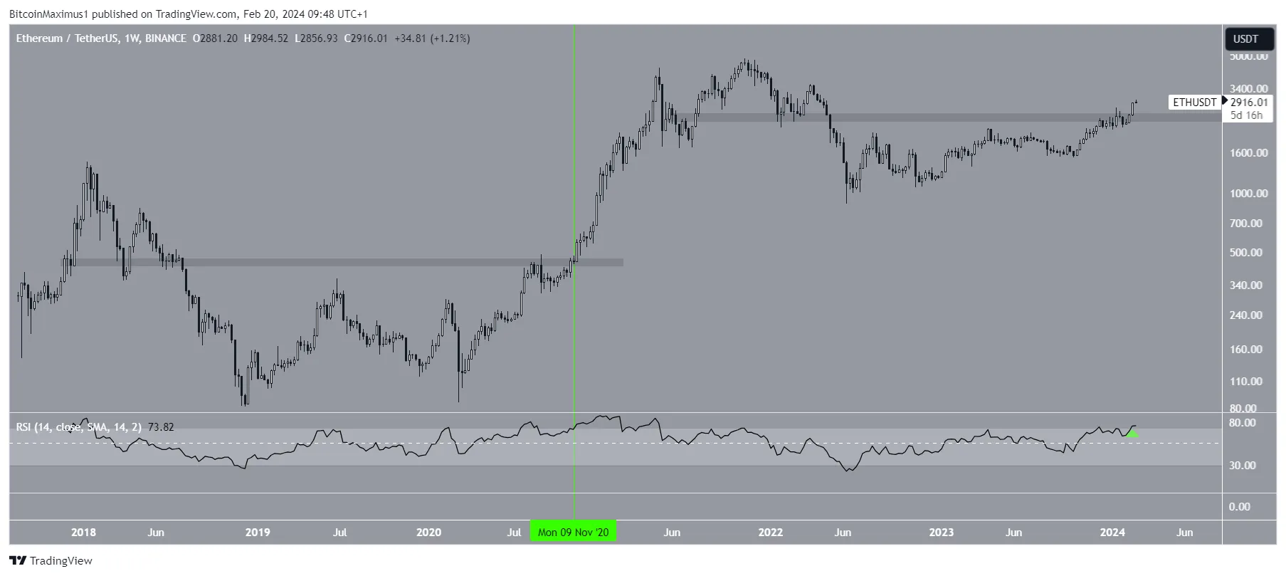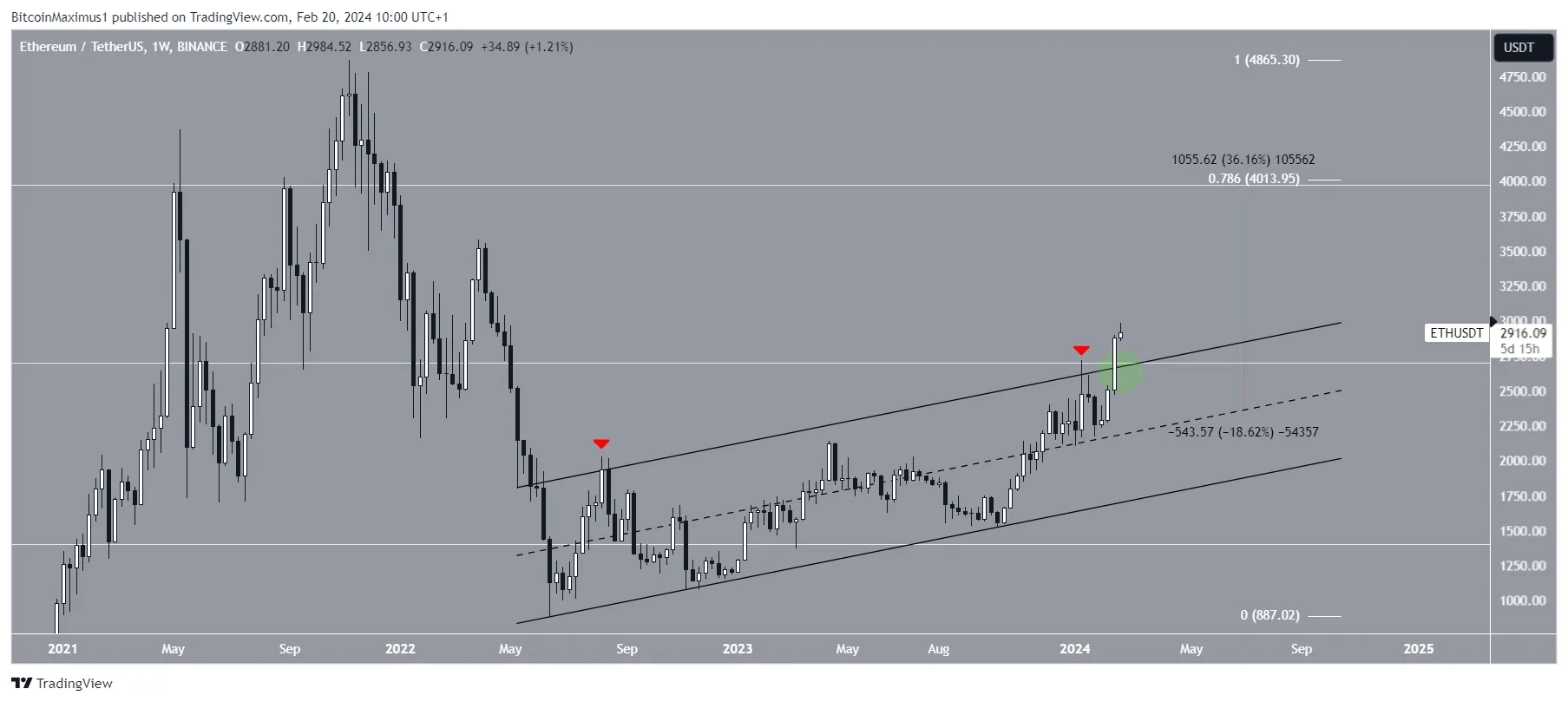 A análise técnica do gráfico semanal mostra que o Ethereum subiu rapidamente desde outubro de 2023.