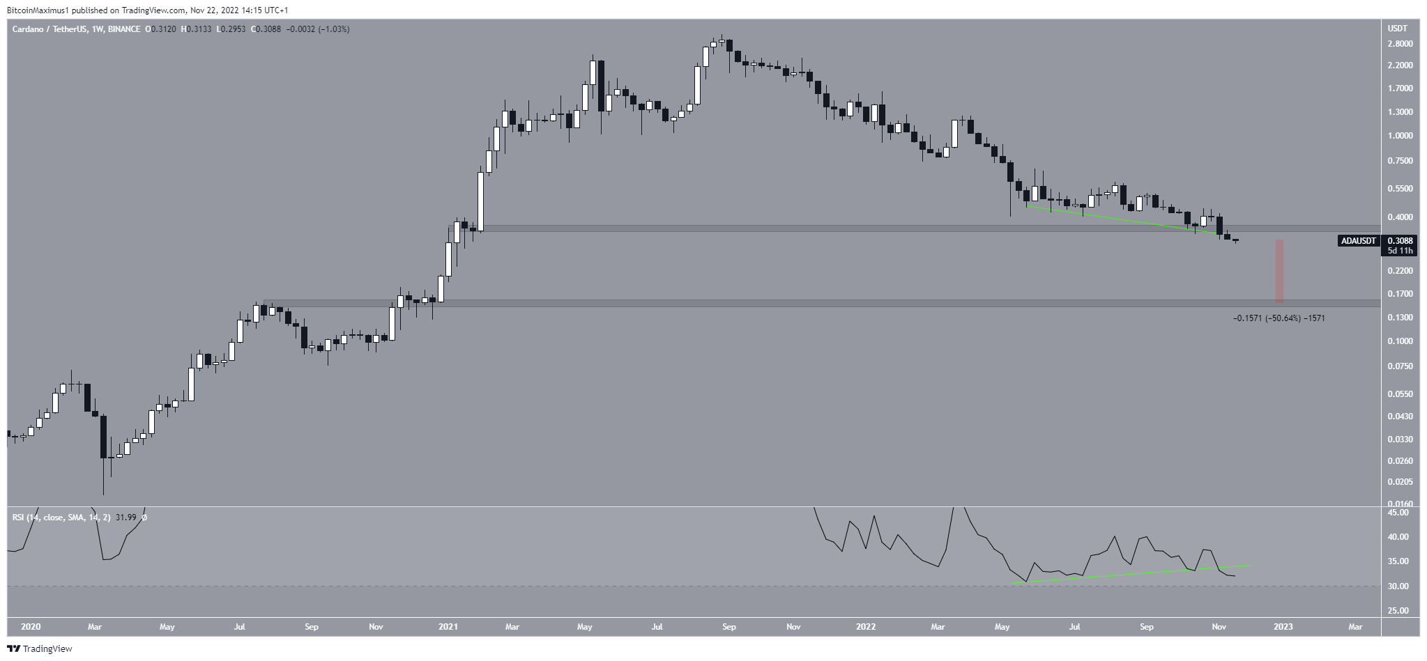 Uma das altcoins que está mostrando sinais de baixa é a ADA. O preço do token caiu desde que atingiu sua máxima histórica de US$ 3,10 em agosto de 2021. O ativo formou uma mínima de US$ 0,29 em novembro do ano seguinte.