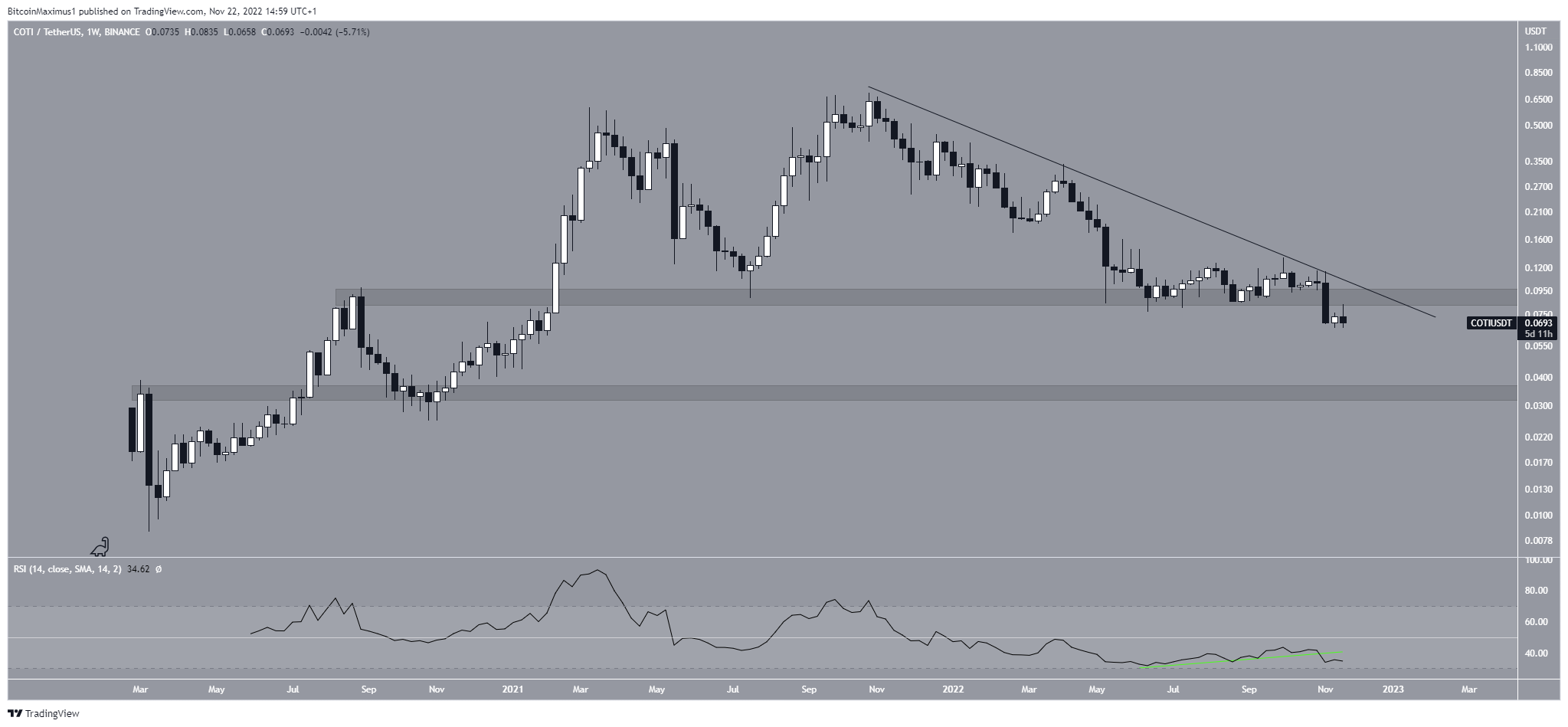 O preço da COTI está em queda desde que atingiu a máxima histórica de US$ 0,69 em outubro de 2021. O movimento levou a uma mínima de US$ 0,06 em novembro de 2022. O ativo está seguindo uma linha de tendência de baixa, que causou uma nova queda em 9 de novembro (vermelho ícone).