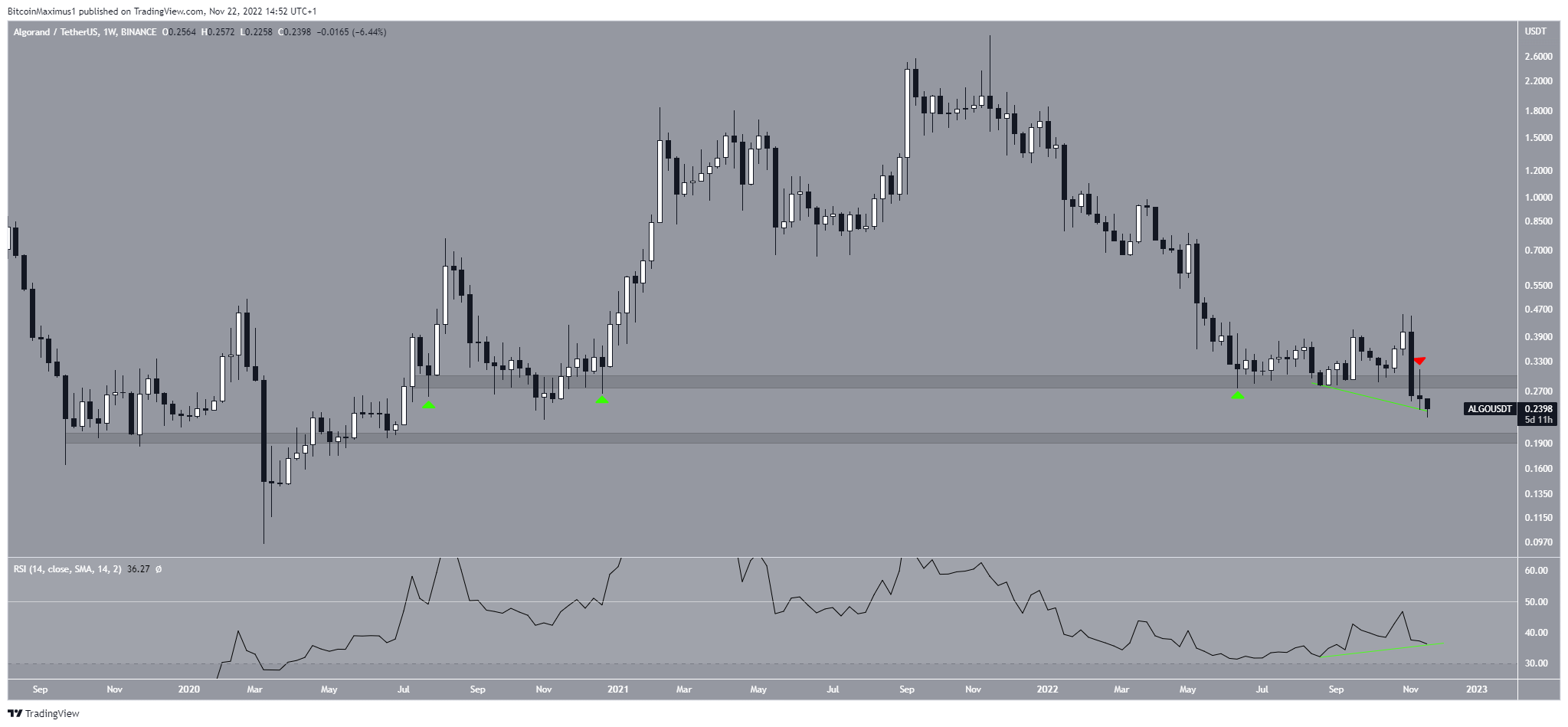 Outra altcoin que caiu consideravelmente é a ALGO. Seu preço caiu desde novembro de 2021, quando atingiu a máxima de US$ 2,99. O movimento causou uma queda abaixo da área de US$ 0,28, que agora foi validada como resistência (ícone vermelho).