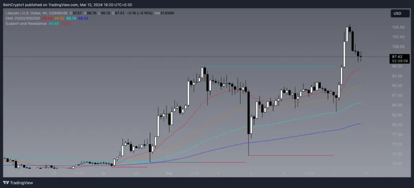 Uma revisão do gráfico de preços do Litecoin (LTC) antes do recente salto de 40% revela um cenário interessante. A linha da média móvel exponencial (EMA) de 200 dias foi posicionada abaixo das linhas de curto prazo e do preço atual. Esta configuração técnica específica, muitas vezes interpretada como um sinal de alta, coincidiu com uma rápida valorização de US$ 86 para US$ 105 em um único dia de negociação.