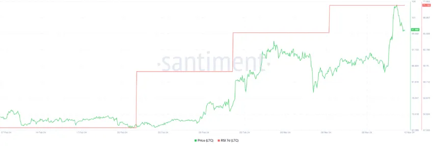 Tal mudança no RSI sinaliza um aumento robusto na pressão de compra do Litecoin, ressaltando um aumento significativo no interesse dos investidores e na atividade do mercado. Este salto além do limite de sobrecompra de 70 sugere algumas implicações críticas para a trajetória de preços de curto prazo.