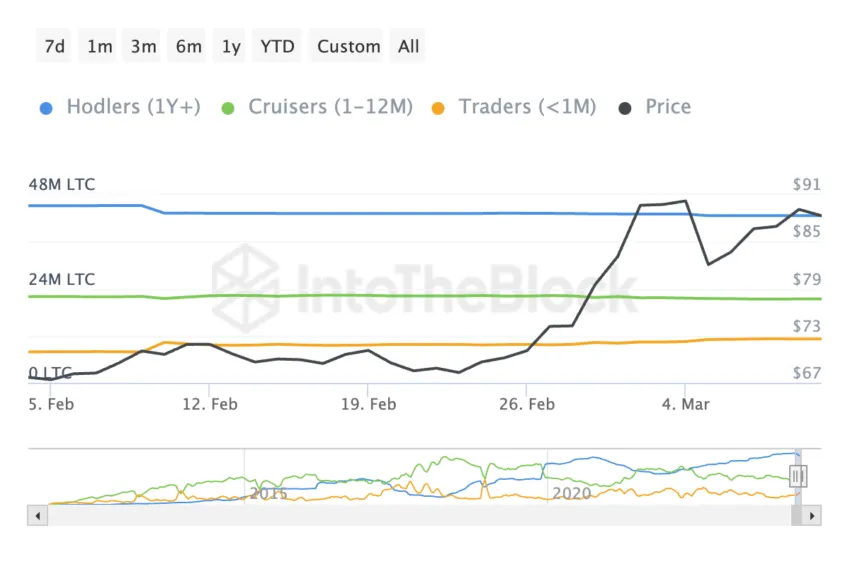 A análise de quanto tempo os usuários mantêm o LTC revela um aumento nos traders de curto prazo. O montante em posse dos usuários que possuem o ativo por menos de um mês saltou de 7,84 milhões de moedas para impressionantes 11,13 milhões. Isso representa um aumento de 41,96% em apenas um mês.