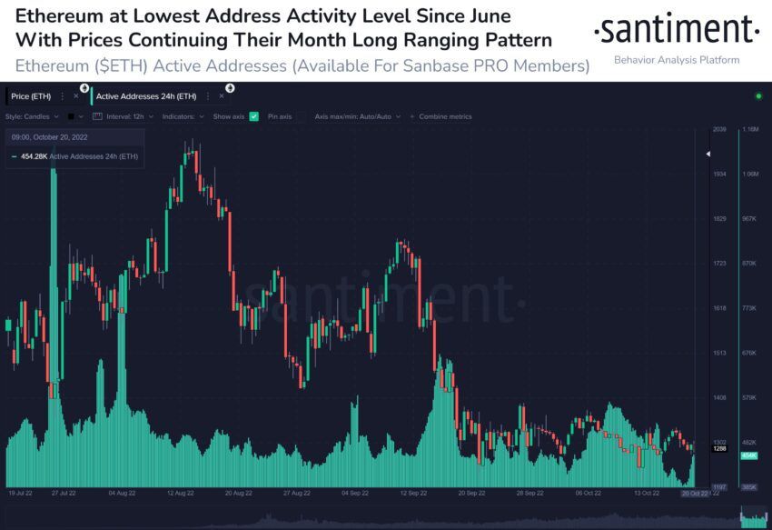 Uma tendência preocupante, no entanto, foi que os endereços ativos do Ethereum caíram para valores mínimos de 4 meses, à medida que as mãos fracas continuavam a cair após a fusão. Isso também apresentou um nível mais alto de desinteresse dos participantes, pois a ação do preço permanece estagnada. A última segunda-feira (17) foi o primeiro dia em que havia menos de 400.000 endereços ativos na rede desde 26 de junho.