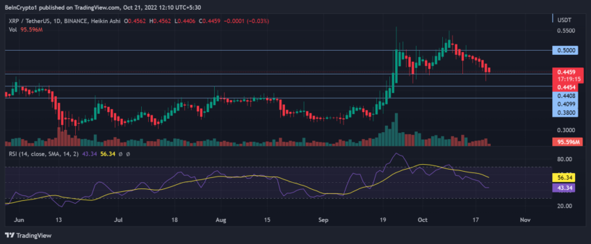 Se a previsão de baixa falhar e os compradores assumirem a ação de preço no fim de semana, o XRP poderá subir para a próxima marca de resistência em US$ 0,48.