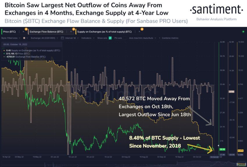 Recentemente, o Bitcoin viu um enorme aumento de moedas saindo das exchanges, registrando sua maior quantidade diária (40.572 BTC) em quatro meses. Com a oferta de moedas nas exchanges caindo para 8,48%, o mesmo caiu as chances de uma liquidação futura.