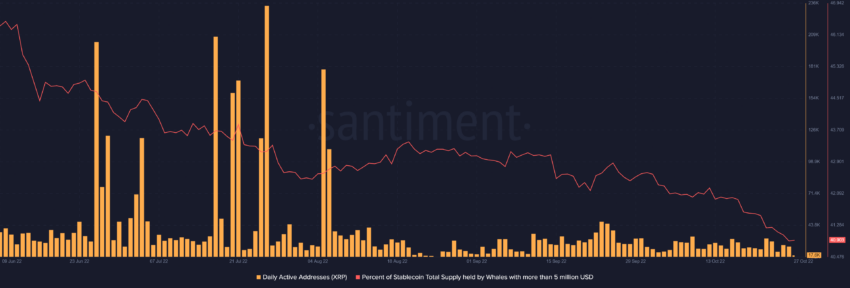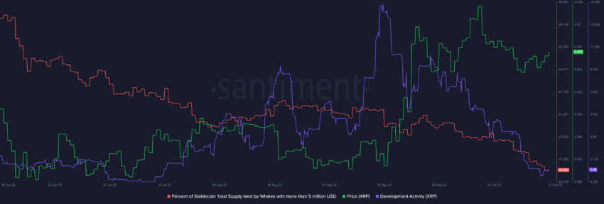 As baleias acumularam cerca de 300 milhões de XRP nos últimos meses, mas isso não afetou muito o preço do token. Enquanto isso, a atividade de desenvolvimento e a oferta total de stablecoins mantidas por baleias com mais de US$ 5 milhões tiveram uma tendência de baixa contínua.