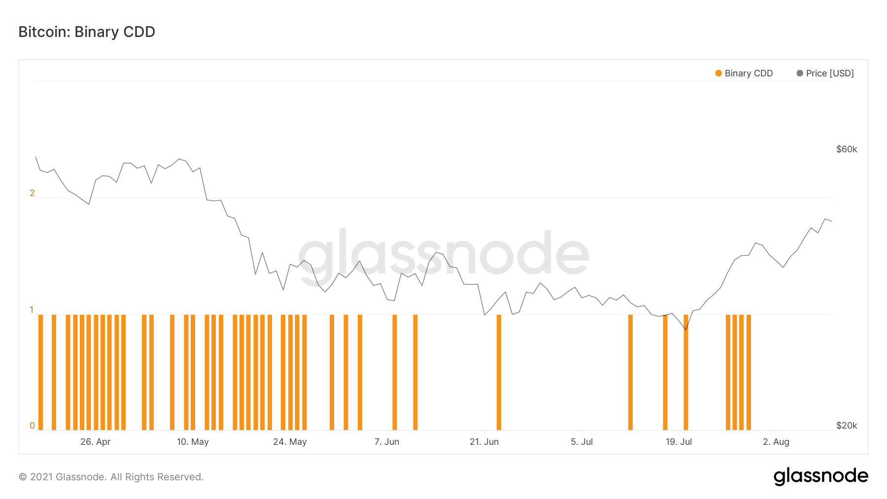 O CDD binário é um indicador que mede se cada dia específico teve uma leitura de dias de moedas zeradas superior à média. Ele dá o valor de um se o CDD do dia for maior do que o CDD médio. Por outro lado, dá um valor zero se não for.