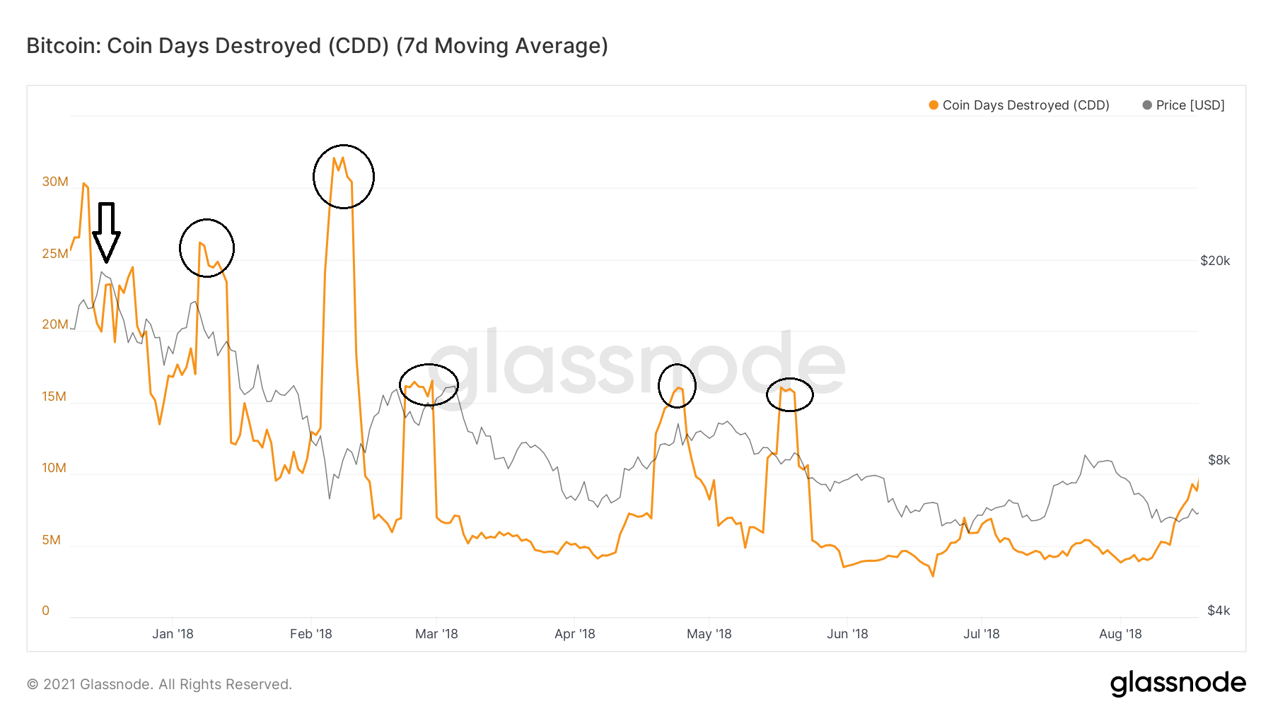 Depois que o topo do BTC de 2017 foi alcançado (seta preta), o CDD subiu consideravelmente várias vezes. Esse era um sinal de que moedas velhas saíam da alta em quase todos as quedas. Em retrospectiva, isso significa que as moedas antigas estavam sendo vendidas nesses picos antes de uma correção de preço.
