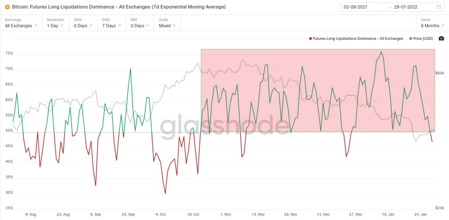 Os enormes prejuízos dos traders que apostam na alta são ilustradas pelo gráfico da EMA de 7 dias para o domínio das liquidações longas. Nessa visão, quase todo o período em que o Bitcoin atingiu seu preço recorde e as quedas subsequentes foi preenchido com o domínio de liquidações de posições de compra (área vermelha).