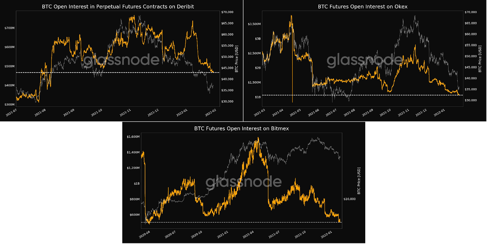 Em uma série recente de tweets da @glassnodealerts, pode-se ver que as posições abertas nessas bolsas estão atingindo mínimas de vários meses (linhas tracejadas brancas). Para Deribit, por exemplo, este é o menor valor em 5 meses, e os juros em aberto é menor do que durante a correção de setembro. No entanto, o valor a mais baixo é registrado pela Okex: mínima de 9 meses e Bitmex: menor valor em 21 meses.