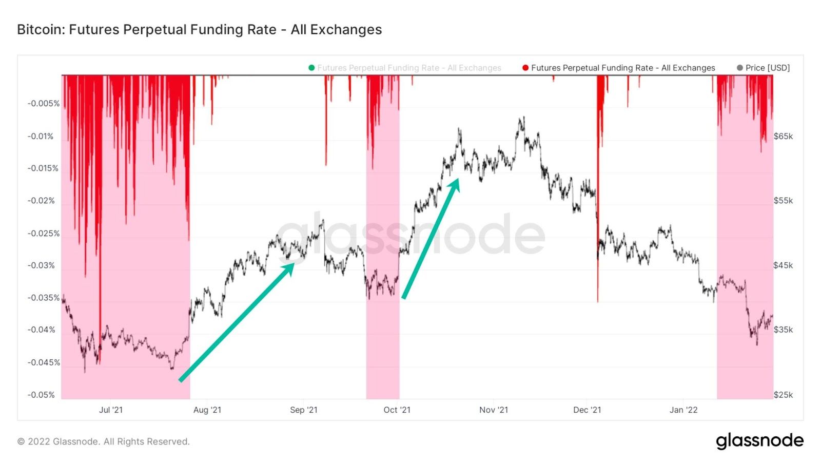 Em um tweet feito no domingo (30), o analista de mercado de criptomoedas @TheRealPlanC publicou um gráfico de taxas de financiamento de junho a julho de 2021. Ele observou que dois períodos anteriores de domínio de taxas de financiamento negativas (áreas vermelhas) precederam aumentos dinâmicos no preço do Bitcoin (setas verdes).