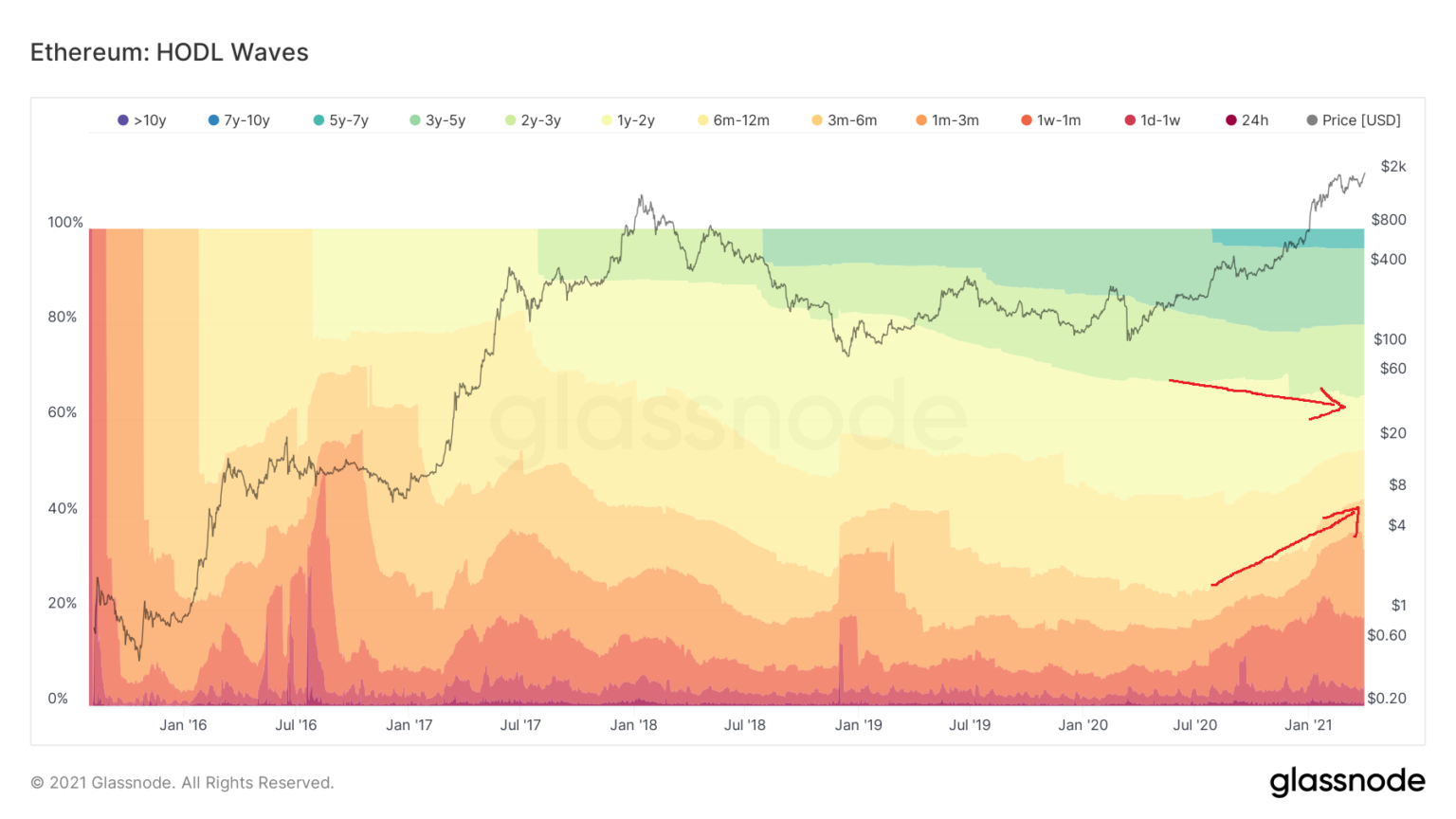 O indicador Ondas de Acúmulo mostra que a quantidade de ETH mantida por mais de seis meses vem diminuindo desde maio de 2020. Isso pode estar relacionado ao crescimento dinâmico do mundo DeFi e à transferência de ETH para contratos inteligentes, bem como ao staking de ETH no final do ano passado.
