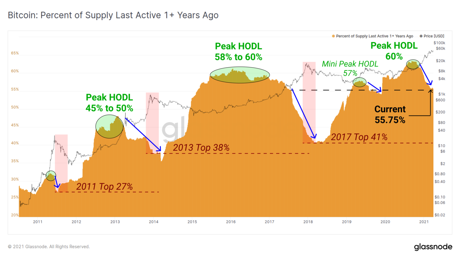 Esta semana, alguns indicadores sugerem a criação de uma base sólida para a continuação do rali de alta no segundo trimestre de 2021. Os “hodlers” de longo prazo estão cada vez mais vendendo seu BTC, mas ainda há mais espaço para potenciais ganhos.