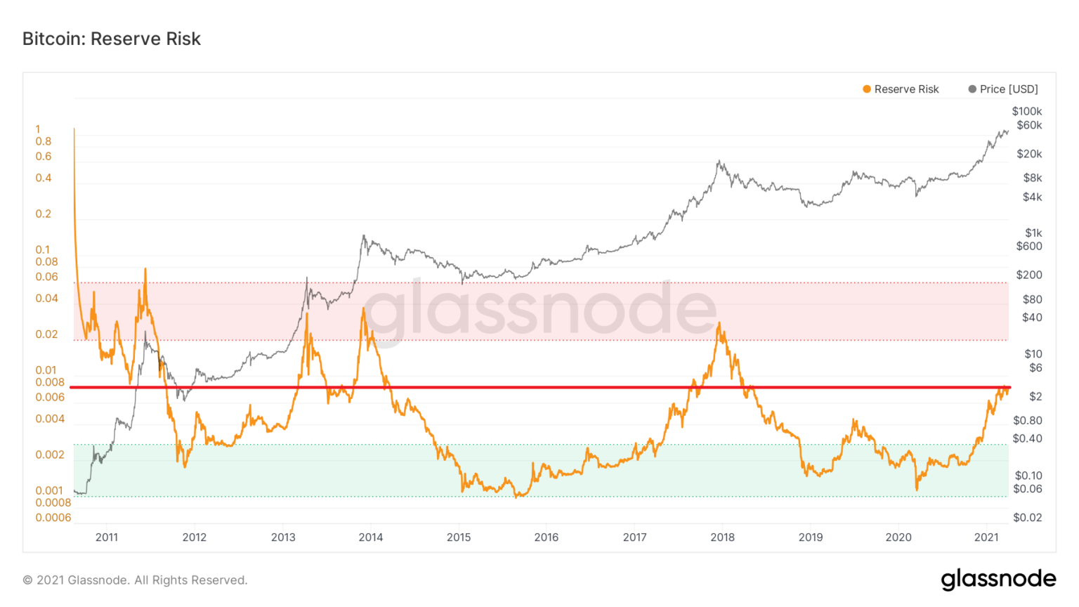 Outro indicador que sinaliza um mercado em alta em maturação é o Risco de Reserva. O indicador é usado para avaliar o nível de confiança de hodlers de longo prazo em relação ao preço atual do BTC. Quanto mais fortes forem as mãos dos hodlers, maior será sua tolerância ao risco e eles estarão dispostos a vender bitcoin em um nível de risco de reserva mais alto.