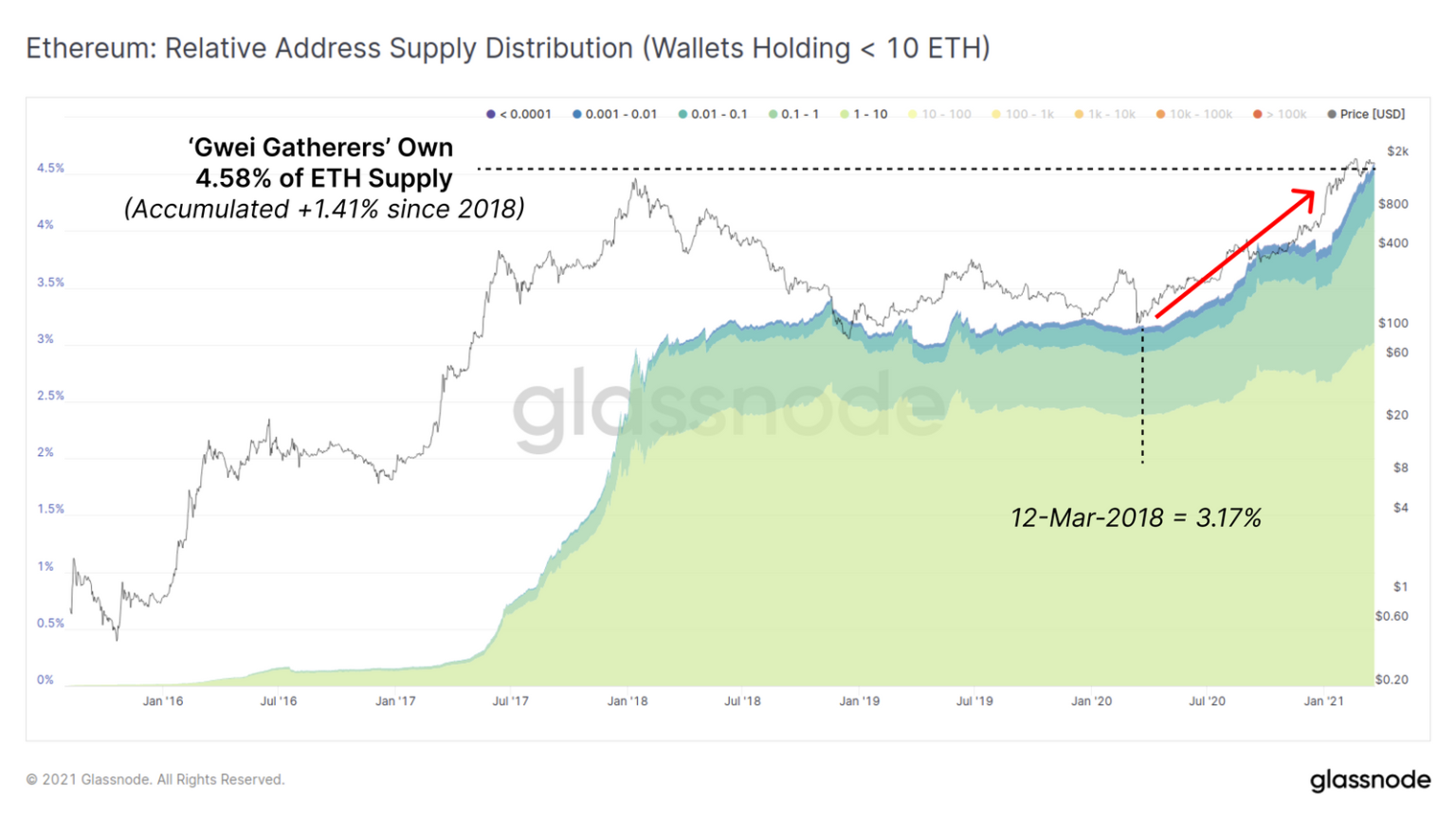 Não são apenas os investidores bitcoin que acumulam seus ativos. A partir de março de 2020, é visível o aumento contínuo em carteiras de ethereum (ETH) com um saldo de menos de 10 ETH. De acordo com o indicador Distribução de Oferta por Endereços Relativos (RASD), os “coletores de Gwei” atualmente possuem 4,58% da oferta total de ETH.