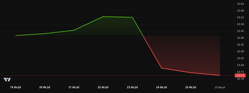 Após esse impulso, o preço caiu cerca de 11% entre 23 e 24 de julho de US$ 0,26 para US$ 0,24, com volumes excedendo 2,2 bilhões, representando a saída de posições longas e intensa pressão de venda.