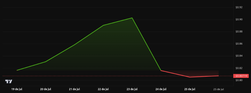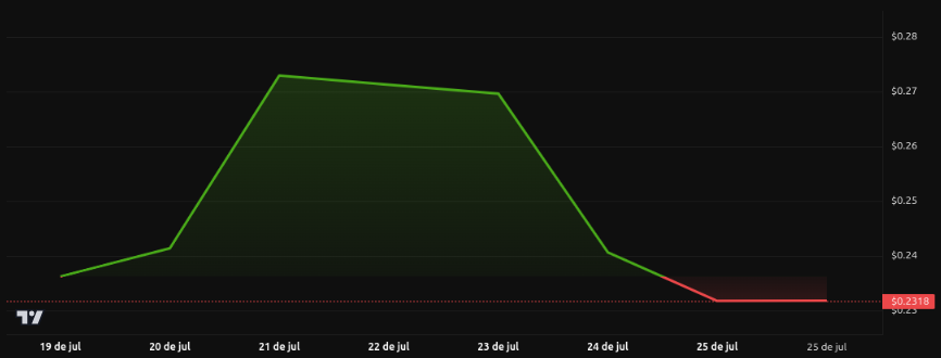 De 24 a 25 de julho, houve estabilização em torno de US$ 0,23, construindo um possível fundo duplo, um padrão de reversão técnica identificado por analistas que poderia impulsionar uma alta em direção a US$ 0,32 adiante se um forte suporte for confirmado.