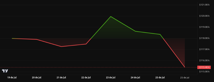 Entre 21 e 25 de julho, o Bitcoin se moveu dentro de um canal descendente em um período de 4 horas, após múltiplas rejeições da faixa de resistência entre US$ 118.800 e US$ 119.200.